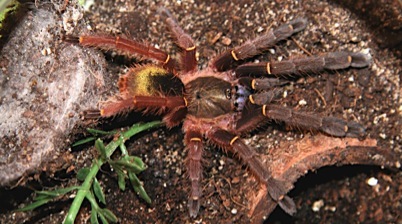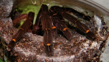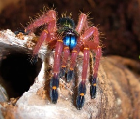 Verhalten: Die Blauzahnvogelspinne ist ein Lauerjäger und befindet sich meist außerhalb ihres Versteckes, flüchtet jedoch bei der leisesten Bewegung in ihre Wohnröhre. Sie ist extrem scheu und flink, und beißt sofort zu, wenn sie in eine Ecke getrieben wird.