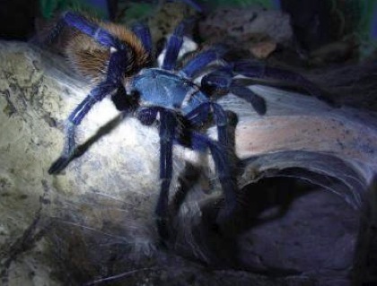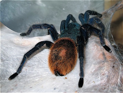 Beschreibung: Dieser Bodenbewohner zeigt eine blaue Grundfärbung auf. Das Hinterleib ist dicht mit rotem Haar bewachsen. Oft schimmert der Carapax (Vorderleib) der Tiere moosgrün. Die Tiere erreichten eine Körperlänge von bis zu 8 cm.