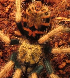 Jungtiere der Chromatopelma haben einen wunderschönen goldenen Carapax und ein Tigermuster am Abdomen.