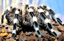 Beschreibung: Diese Riesenvogelspinne erreicht eine Körperlänge von etwa 9 cm und gehört damit zu den größten Vertretern der Vogelspinnen. Sie wird manchmal auch als "Weiße Smithi" bezeichnet, da ihr schwarzer Körper in einem cremefarbenem Weiß gebändert ist. SIe hatleicht rötlichen Haaren auf dem Hinterleib (Abdomen).